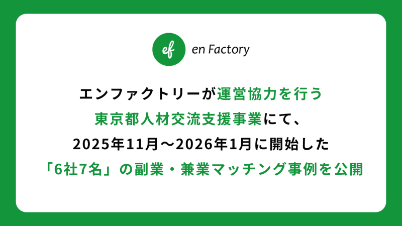 株式会社エンファクトリー(東京都千代田区、代表取締役:加藤健太)は、東京都の「令和7年度大企業と連携した中小企業・スタートアップの成長促進に向けた人材交流支援事業」(以下「本事業」)の運営協力を行っています。この度、本事業を通じて2025年11月から2026年1月にかけて副業・兼業を開始した6社7名の活動状況およびマッチング事例詳細を公開したことをお知らせいたします。